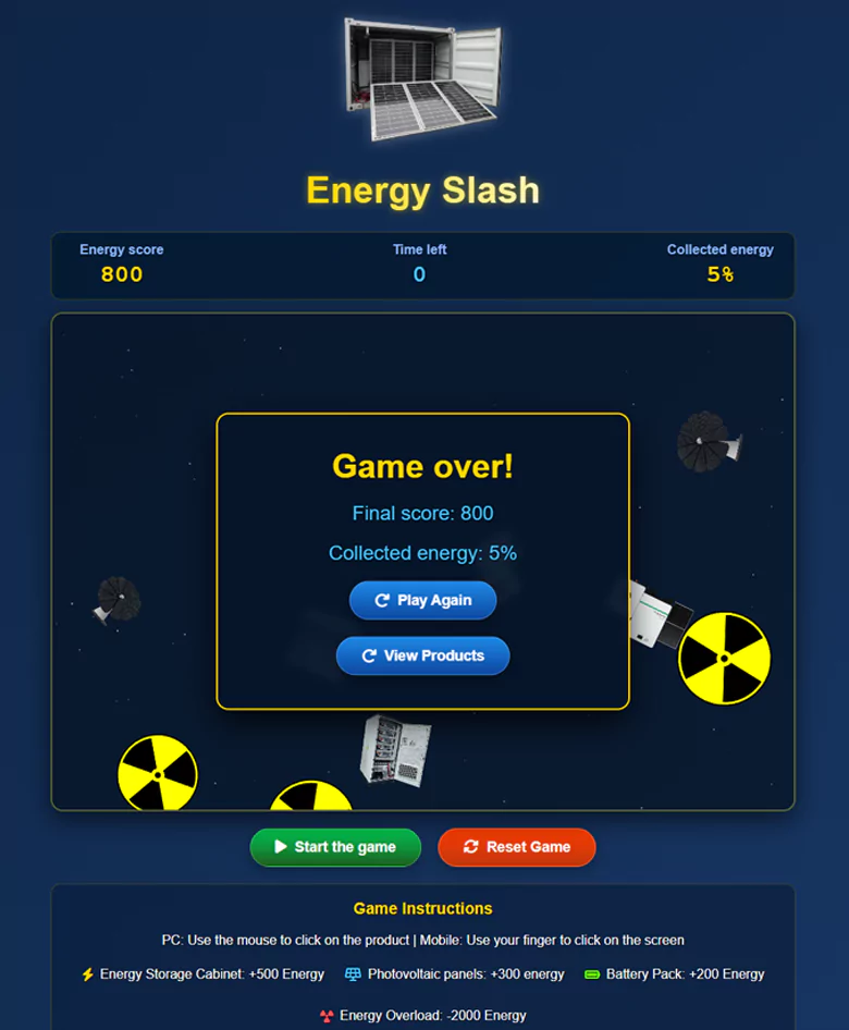 Energy Slash is an interactive cutting game where players collect solar and storage energy points while avoiding power overloads.